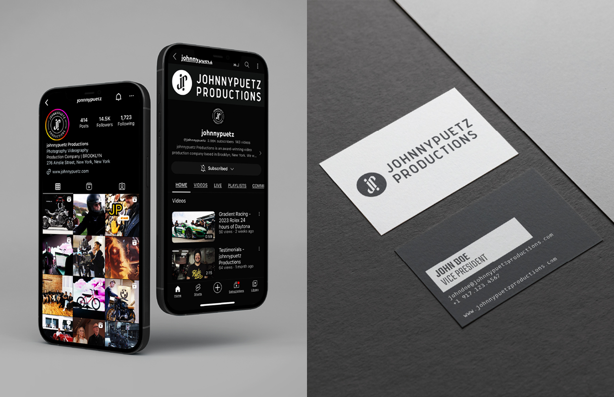 Johnnypuetz Productions is an award-winning video production company based in Brooklyn, New York. The brand identity revolves around the dynamic nature of the rotational ambigram logo (reads the same when viewed upside down): the letters J and P are encased in the circle shape and become almost abstract shape. The overall color scheme aims at not being distracting, so that it relies on monochrome elements to make space for their products (videos).